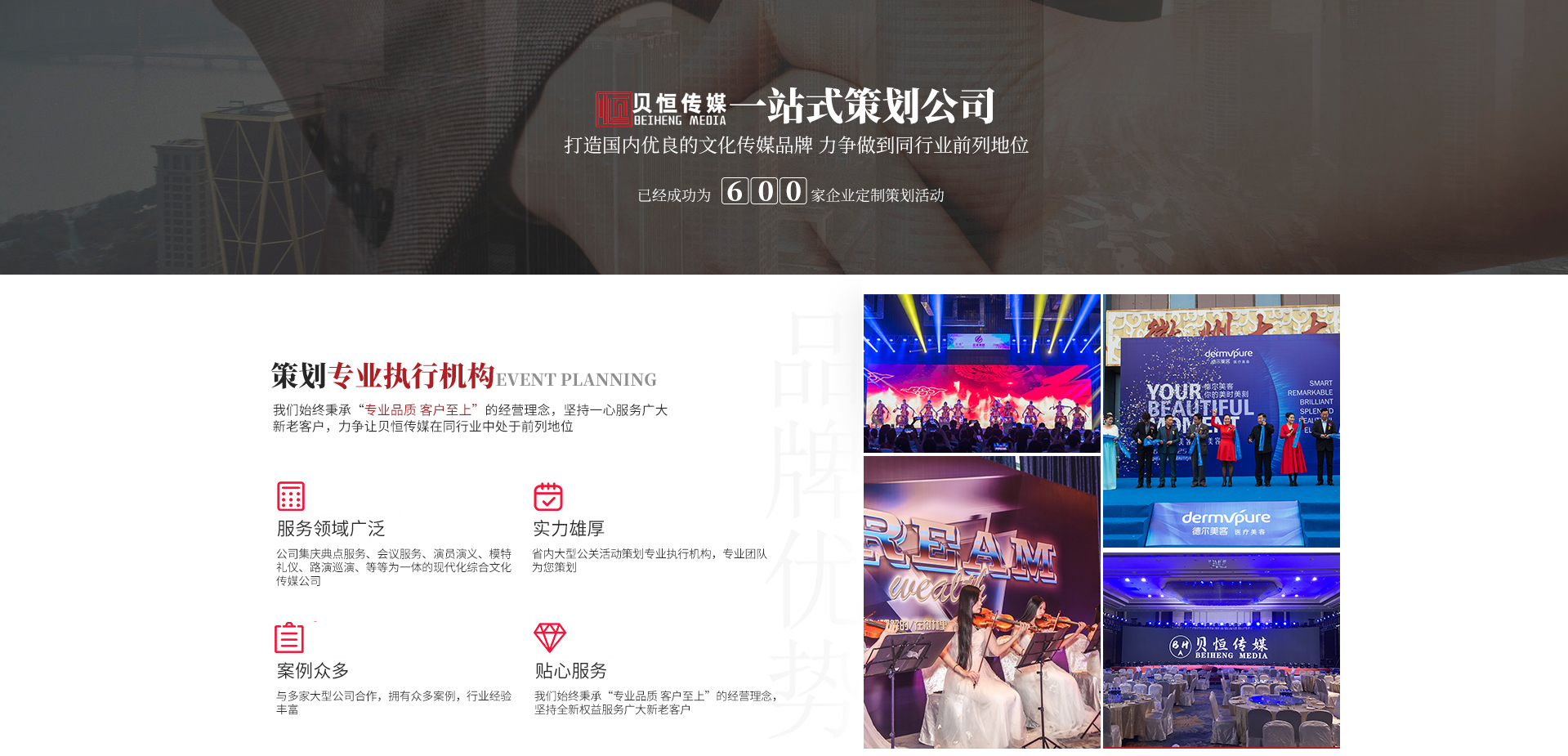 - 合 肥 貝 恒 文 化 傳 媒 專注·專業(yè)·專心·效率 合肥貝恒文化傳媒有限公司2017年成立于安徽·合肥,是省內(nèi)大型公關(guān)活動(dòng)策劃專業(yè)執(zhí)行機(jī)構(gòu),公司集慶典服務(wù)、會(huì)議服務(wù)、演員演藝、模特禮儀、路演巡演、展會(huì)特裝、廣告制作、設(shè)備租賃、舞美策劃、企業(yè)形象宣傳等為一體的現(xiàn)代化綜合文化傳媒公司,我們始終秉承“專業(yè)品質(zhì)客戶至上”的經(jīng)營(yíng)理念,堅(jiān)持全...
